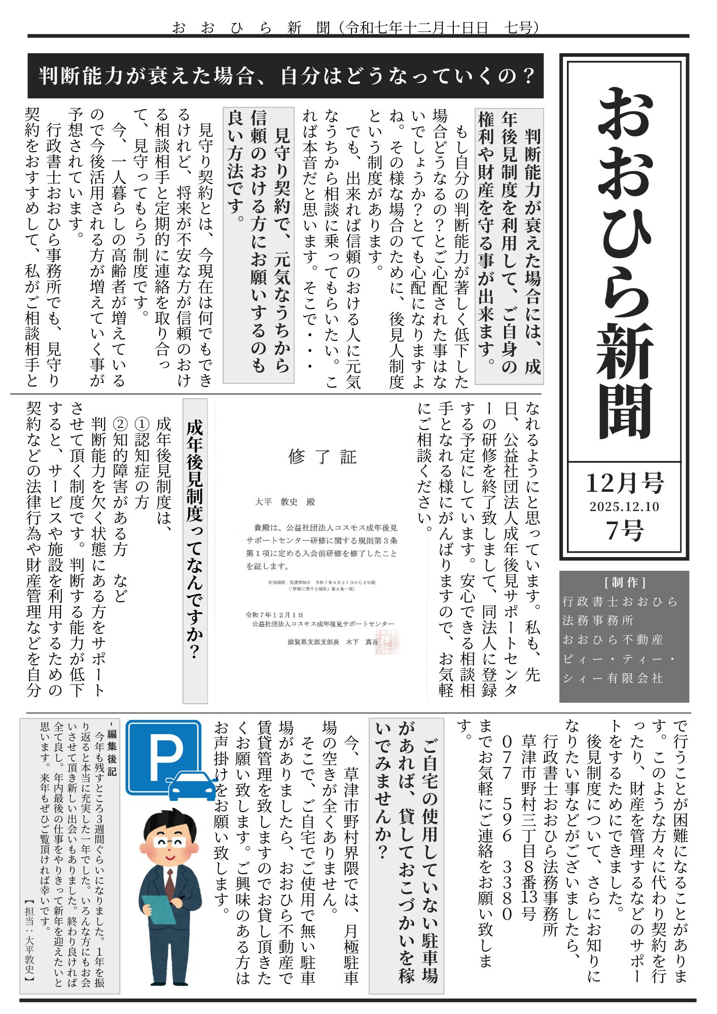 おおひら新聞 令和7年12月10日 第7号 2025 12/11 お役立ち情報 2025年12月10日2025年12月11日 今月おおひら新聞のメインテーマは、後見制度について 『判断能力は衰えた場合、自分はどうなっていくの!?』です! おおひらモカ先生 こんにちは!行政書士のおおひらです!実は、毎月「おおひら新聞」を発行しています。地域の方には、ポスティングをおこない、SNS等でもご覧いただけます。これからもよろしくお願い致します! 20251210ダウンロード おおひらモカ先生 ダウンロードして頂いて、ぜひご興味のある方にもお渡ししてあげてくださいね!よろしくお願い致します! お役立ち情報 おおひら不動産 モカ先生 居住支援 成年後見制度 草津市 行政書士おおひら法務事務所 よかったらシェアしてね! URLをコピーしました! URLをコピーしました! 【ご相談】(仮名)みゆきさんからの借金に関するご相談 私は高齢者です。私になにかあったときにペットはどうなるのですか? この記事を書いた人 おおひら 行政書士 関連記事 私は高齢者です。私になにかあったときにペットはどうなるのですか? 2026年1月1日 【ご相談】(仮名)みゆきさんからの借金に関するご相談 2025年11月23日 令和8年カレンダーを差し上げています! 2025年10月30日 あまり知られたくないですよね?離婚した事なんて。 2025年10月21日 Home Pageを作成して頂きました! 2025年10月14日 コメント コメントする コメントをキャンセルコメント ※ 名前 ※ メール ※ サイト 次回のコメントで使用するためブラウザーに自分の名前、メールアドレス、サイトを保存する。 上に表示された文字を入力してください。